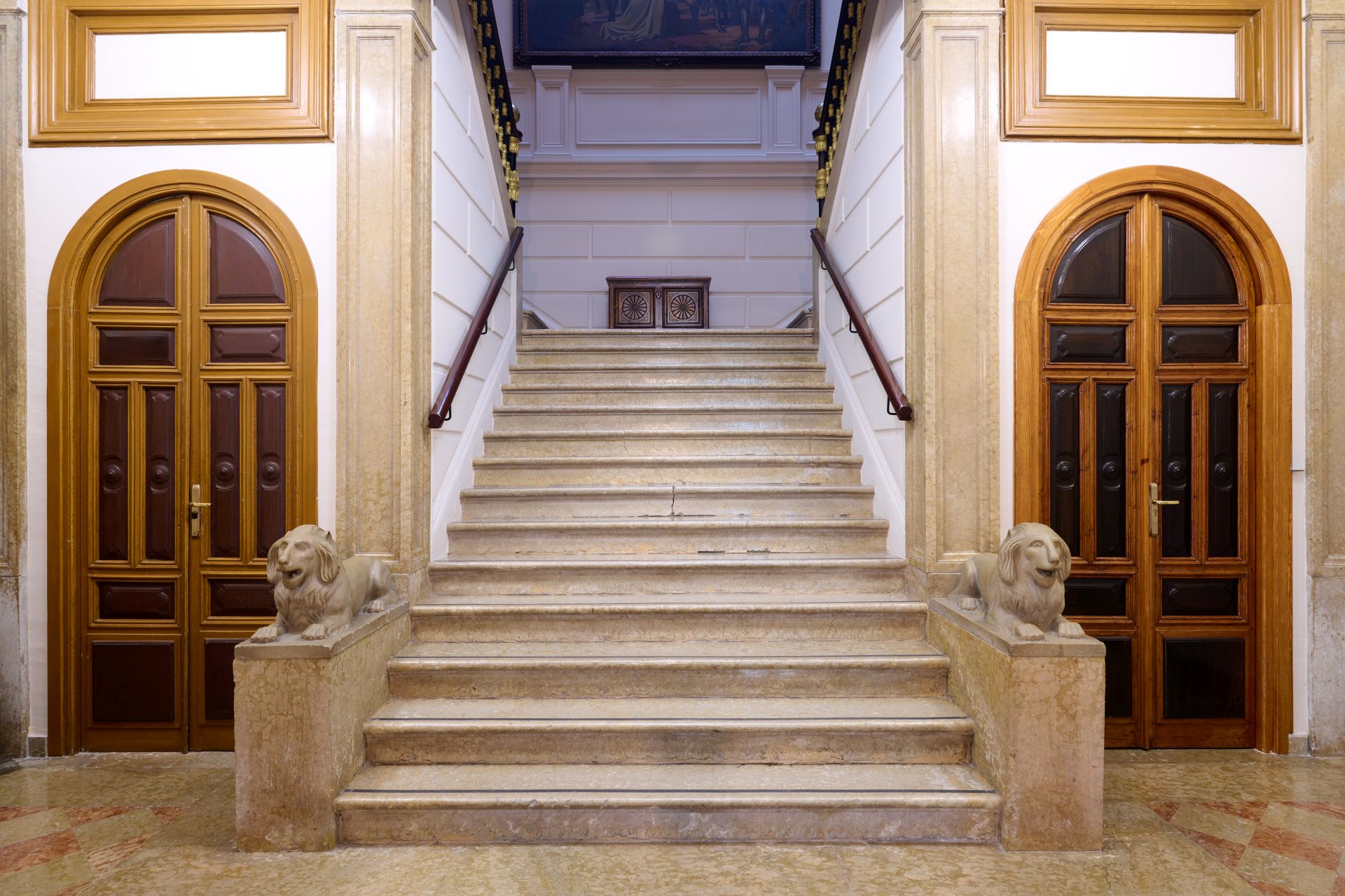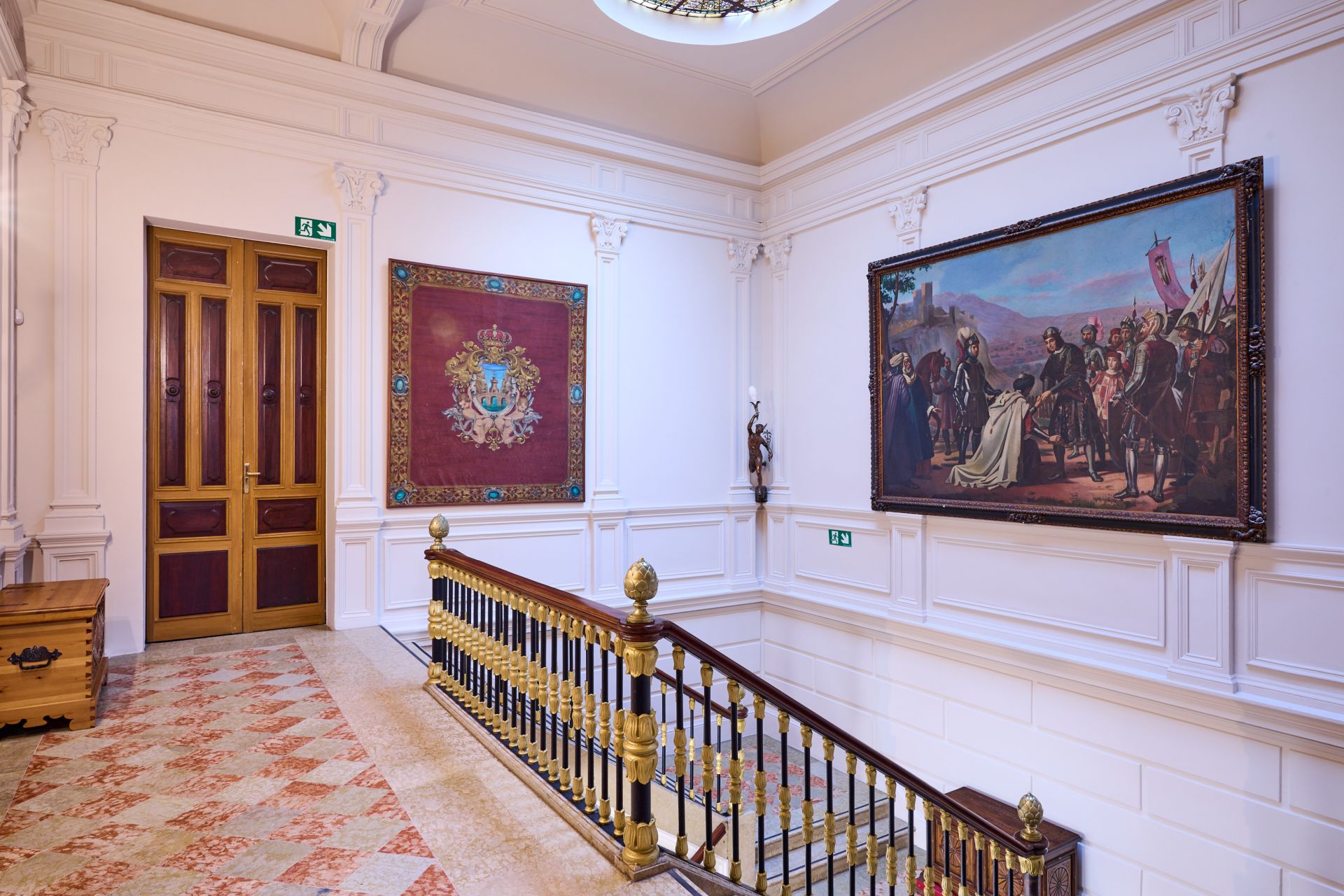 La escalera principal, de doble tramo, está custodiada por dos leones que simbolizan la fuerza y el poder. Asciende hasta la antesala, donde se pueden contemplar el cuadro de la Conquista de Granada, los escudos de la ciudad y una pintura de la patrona de Loja, la Virgen de la Caridad.