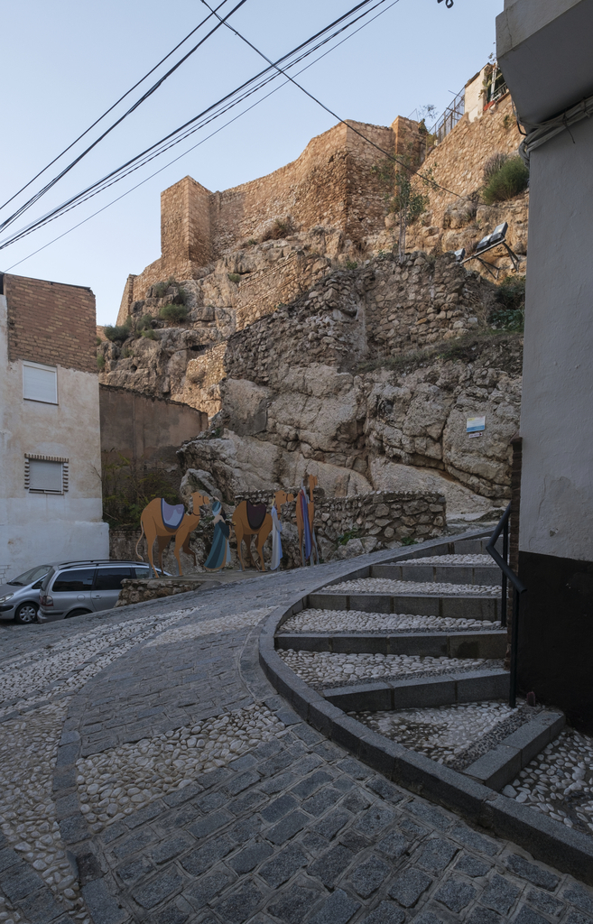 El recinto amurallado organizaba la ciudad nazarí en tres barrios diferenciados: la Alcazaba en lo alto del cerro, el Arrabal como sector principal con la mezquita mayor, baños y zoco, y el Jaufín en la ladera norte (del árabe Yawfí, «umbría»). Esta estructura urbana, mantenida durante siglos, se protegía mediante un anillo defensivo jalonado por torres como la del Cubo, la de Panes, la de Maldonado, la de Alfaguara y la de Basurto —la más fuerte de todas—, que vigilaban los accesos a una ciudad que llegó a contar con 201 viviendas solo en el barrio del Jaufín.
